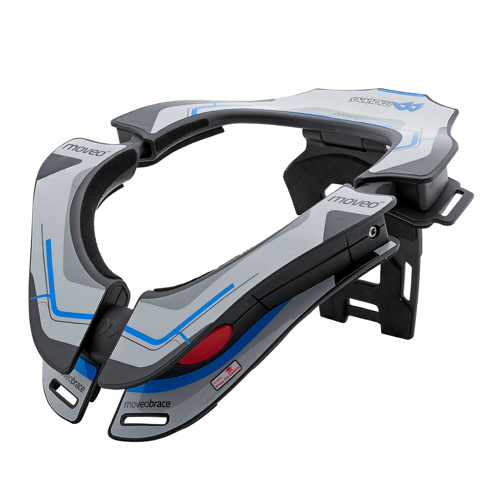 Moveo Brace Concept is a motorcycle protection device that, together with a full-face helmet, reduces neck injuries caused by hyper-flexion, hyper-extension, axial load, shear load, lateral hyper-flexion and whiplash, limiting rotation and transferring excessive load from neck to the rest of the body through his rigid frame. The frames of this Moveo Neck Brace model are made of thermoplastic material reinforced with fiberglass, making this device highly resistant and with an optimum performance in case of critical impact situations. The flexible hinges are made of thermoplastic elastomer. As the other Moveo Neck Brace models, this neck brace features different ways to couple with jackets (velcro, straps, etc.) and the innovative flexible hinge design system, which allows the use of the Moveo Neck Brace Dynamic in your daily commuting, and besides to practice motocross, adventure tours or racing activities. Thanks to his design, the system fits up to 4 different sizes (S-XL) without necessity of changing or removing parts. Separate stickers available. Weight: 590g.